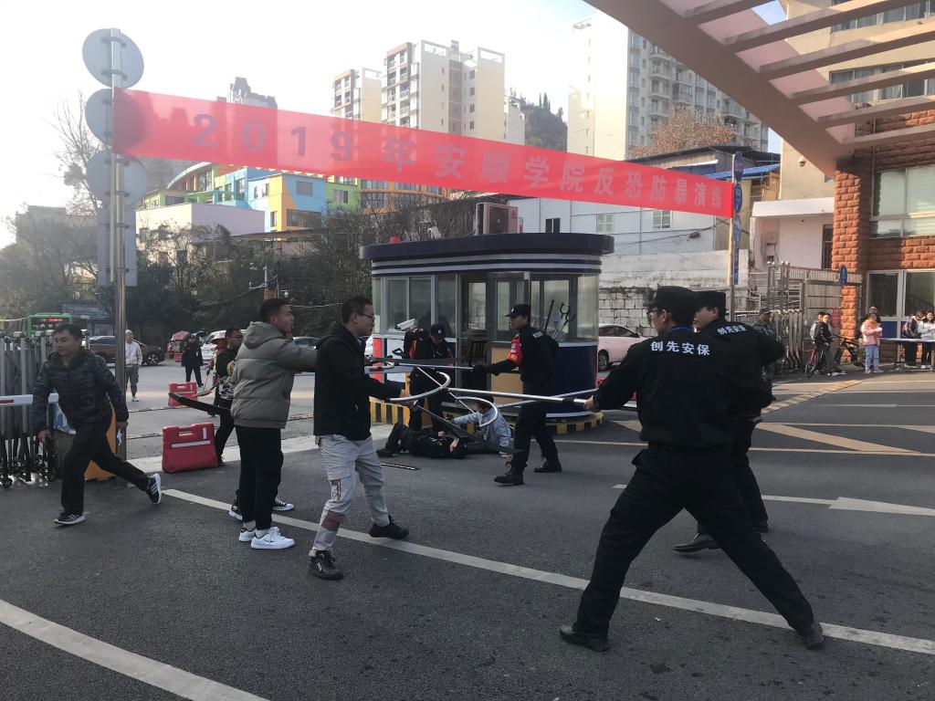 为切实做好校园安全,加强师生面对突发事件防范意识,提高面对突发事件的合理处置,自护自救及时有效的逃生避险的能力,最大限度减少突发恐怖事件对全校师生带来的人员伤害,确保学校内部的安全和师生的人身安全,2019年12月13日上午9点40分,“2019年度安顺学院防恐防暴演练”在安顺学院大门处顺利拉开帷幕。