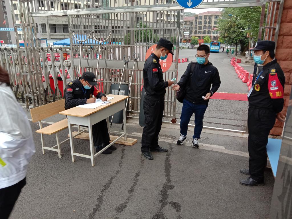 5月11日毕业班学生已开学上课,为保证在校师生的生命安全,保卫处严格要求安保人员提高自身素质,提高文明用语学习,在保证自己健康安全的前提下把好门卫关卡,对进入学校的师生、家属、车辆严格检查,做好证件查验及测温工作。