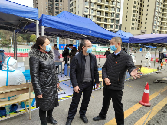 (党委书记罗荣彬【左二】、副校长殷红敏【左一】现场查看疫情防控工作)
