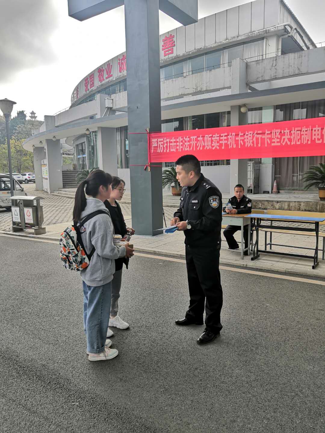 10月27日下午3时,保卫处联合安顺市公安局经济技术开发区分局西航派出所到我校开展非法开办贩卖手机卡银行卡电信网络诈骗犯罪宣传活动。