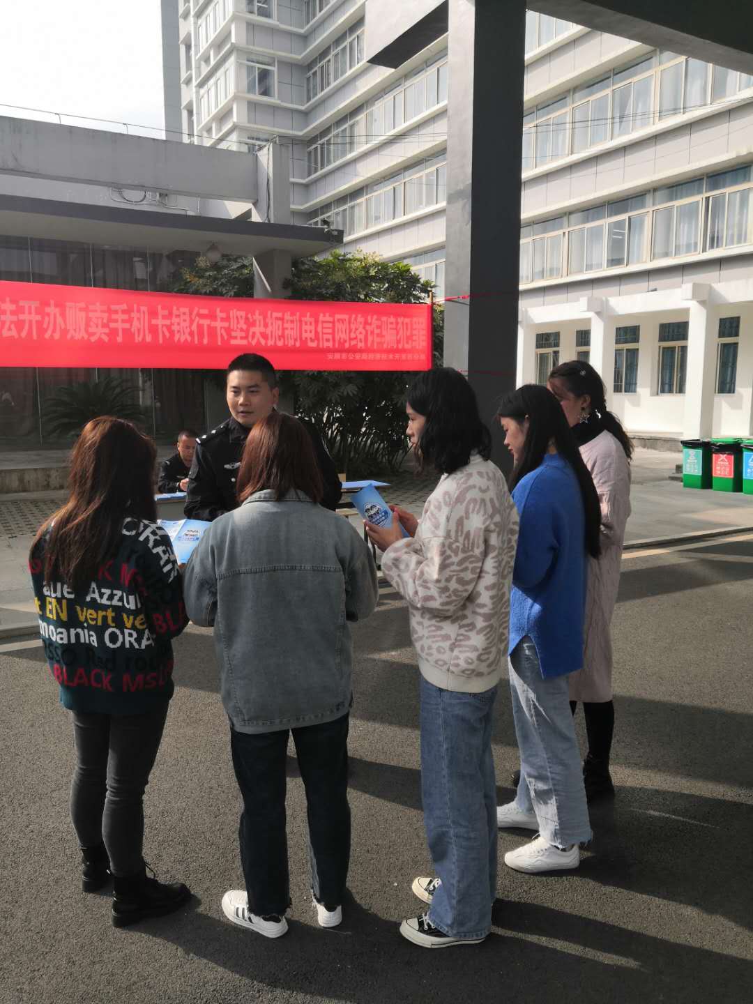 西航派出所民警姚林海在校内开起了“露天课堂”,一边将反诈宣传单发给过往师生,一边讲解各类与学生日常生活密切相关的安全防范知识,特别是针对大学生同学的网络刷单、网络兼职、租借银行卡、身份证、微信支付宝账号等违法犯罪活动,并向学校师生宣传普及了“断卡”行动相关安全防范知识。